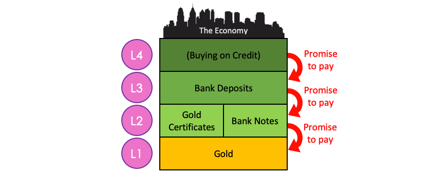 Bank notes (or gold certificates) (Layer 2) are promises to pay physical gold.