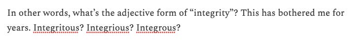 In other words, what’s the adjective form of “integrity”? This has bothered me for years. Integritous? Integrious? Integrous?
